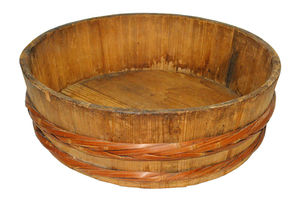 洗濯盥と寿司桶の区別がつきにくいが、底部が平らでべた置きになるものが寿司桶で、脚がついているものが、洗濯盥ではなかろうか。土間や庭での洗濯のとき、水が洗濯板の下をスムーズに通るようにである。
