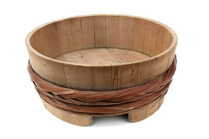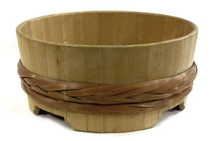 洗濯板と寿司桶の区別がつきにくいが、底部が平らでべた沖になるものが寿司桶で、脚がついているものが、洗濯盥ではなかろうか。土間や庭での洗濯のとき、水が洗濯板の下をスムーズに通るようにである。