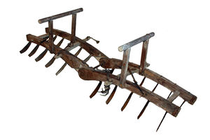 馬鍬(まぐわ)で、田の代を整える代掻き用具。>
