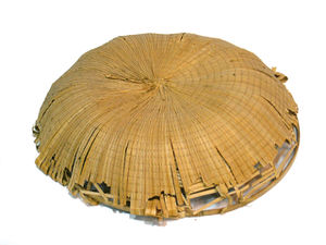 菅笠(すげがさ)で、頭にかむり雨よけ、日よけの役を果す。